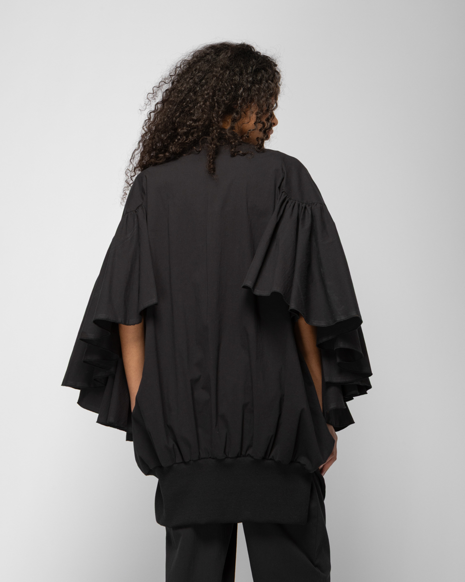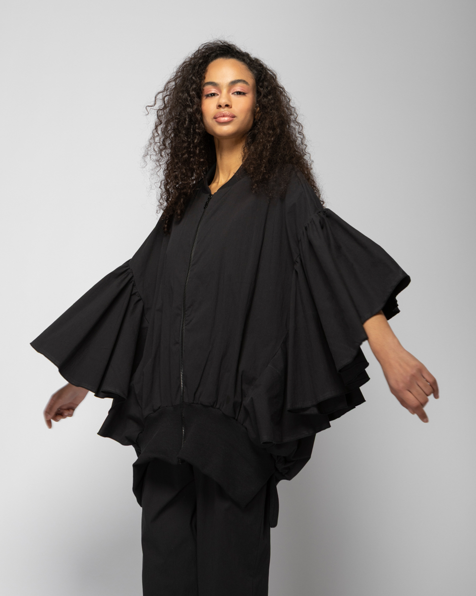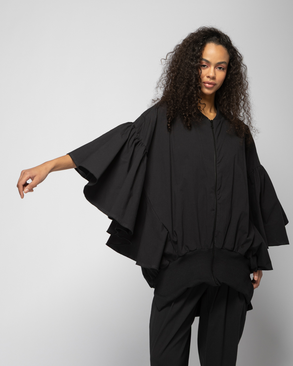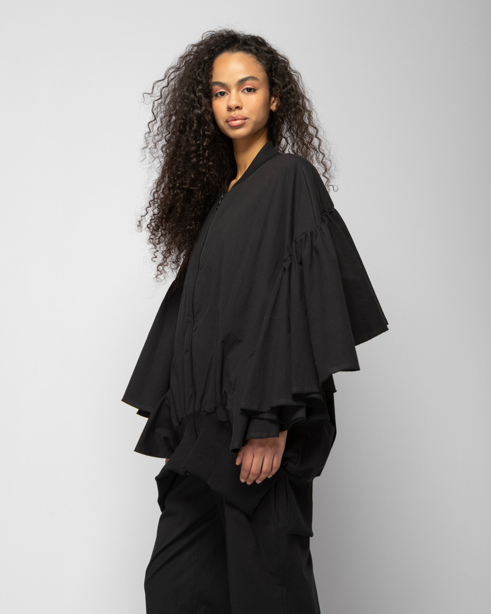 LONG BOMBER WITH FRILLED SLEEVES IN BLACK